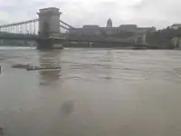 Budapest, Bratislava, and other river cities along the Danube enacted emergency preparations.[21] In Bratislava, the Danube peaked with a volumetric flow rate of 10,530 m3/s (372,000 cu ft/s), which is the highest flow rate ever recorded in Bratislava.[36] In Hungary, the Prime Minister Viktor Orbán declared a state of emergency in some areas along the Danube, which was expected to peak 5 June in western areas and hit Budapest the following weekend. He announced the government had mobilized 8,000 soldiers, 8,000 emergency personnel, 1,400 water management experts, and 3,600 police officers to deal with the situation.[30]