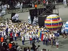 During the parade of nations, giant helium balloons with the country the delegation represented accompanied each delegation.[13] Coincidentally, the opening ceremony took place on Nelson Mandela's birthday. The South African delegation carried with them a large banner reading: "Celebrating our legacy – Mandela Day".[14]