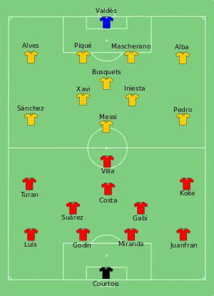 In the second leg, played on 28 August at the Camp Nou, Lionel Messi missed a penalty for Barcelona in the 89th minute, hitting his shot against the crossbar after Miranda had bundled substitute Pedro over in the area.[5] Atlético Madrid had two players sent off: Filipe Luís in the 81st minute for tangling with Dani Alves, and Arda Turan, who had already been substituted, in the first minute of added time for protesting a decision.[6] Barcelona won the cup for a record 11th time on the away goals rule.[7][8]