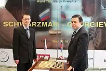 The 2013 World Draughts Championship match at the international draughts was held May 12–18, 2013 in Tallinn, Estonia International Draughts Federation FMJD between the actual World Champion Alexander Georgiev (Russia) and the challenger Alexander Schwartzman (Russia). Alexander Georgiev won and became the world champion for the seven time.
