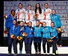 Podium of the women's team sabre: Russia, France, and Ukraine