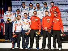 Podium of the men's team sabre: Italy, Russia, and Germany