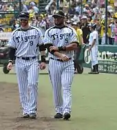 - ↑ Coskrey, Jason (October 25, 2014). "Fifth-inning outburst carries Tigers to Game 1 triumph over Hawks". The Japan Times. Retrieved October 27, 2014.