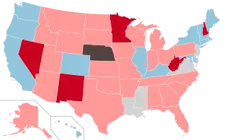Republicans initially gained control of nine legislative chambers: both chambers of the Nevada Legislature (which they held simultaneously for the first time since 1931), the Minnesota House of Representatives, the New Hampshire House of Representatives, the New Mexico House of Representatives for the first time since 1955, the West Virginia House of Delegates, the Colorado Senate, the Maine Senate, and the New York Senate, which was previously under a Republican-led coalition. This increased the total number of Republican-controlled state houses from 58 to 67. The day after the election, Republicans, who achieved a 17–17 tie in the West Virginia Senate, gained control of that chamber as well thanks to the defection of State Senator Daniel Hall, thus increasing their total gains to ten, for a final total of 68 state houses won.[1] This allowed Republicans win control of either chamber of the West Virginia legislature for the first time since 1933.