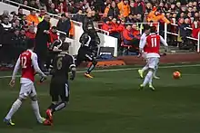 Arsenal started September with a nervy 2–0 win over Stoke City at the Emirates, with Theo Walcott and Olivier Giroud scoring.[6] Between the Stoke clash and a trip to struggling champions Chelsea, Arsenal faced Dinamo Zagreb away in the Champions League. Despite appearing the stronger side, Arsenal slumped to a shock 2–1 defeat, with under-performing striker Giroud being sent off for two yellow cards.[7] The week got worse as Arsenal lost 2–0 at Stamford Bridge, with Santi Cazorla (two yellows) and Gabriel being sent off, the latter incorrectly shown red by Mike Dean for a clash with Diego Costa in which the latter assaulted Laurent Koscielny.[8] Gabriel's ban was reduced from three games to one, but Gabriel, Costa, Chelsea and Arsenal were all fined for player misconduct, with Costa suspended for three games.[9] With the Chelsea incident resolved, Arsenal faced a tough League Cup tie with North London arch-rival club Tottenham Hotspur at White Hart Lane. Mathieu Flamini became an unsung hero with a brace, the second of which was a volley from 20 yards, both goals on the other side of a Calum Chambers own goal.[10] Arsenal, full of confidence after eliminating their rivals, visited the only unbeaten team in the league at the time, Leicester City, who were one point and one place above Arsenal. Despite a brace from Jamie Vardy, Walcott and Giroud scored either side of three goals from Sánchez, who ended a run of seven games without a goal.[11] Arsenal ended their month on a sour note, however, as errors from second-choice goalkeeper David Ospina saw Arsenal lose 3–2 to Olympiacos at home in the Champions League,[12] meaning they were bottom of their group with successive games against in-form Bayern Munich coming up.