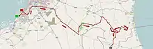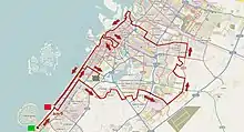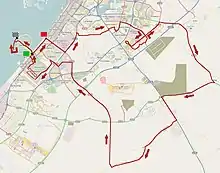 Additionally, there was a points classification, which awarded a red jersey.[14] In the points classification, cyclists received points for finishing in the top 10 in a stage. For winning a stage, a rider earned 20 points, with 16 for second, 12 for third, 9 for fourth, 7 for fifth, 5 for sixth with a point fewer per place down to a single point for 10th place.[15] Points towards the classification could also be accrued at intermediate sprint points during each stage; these intermediate sprints also offered bonus seconds towards the general classification. There was also a sprints classification for the points awarded at the aforementioned intermediate sprints,[16] where the leadership of which was marked by a jersey in the colours of the United Arab Emirates flag.[17]