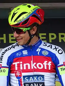 Shortly afterwards, Daniel Oss (BMC Racing Team), wearing the polka dot jersey as he was second to Skujiņš in the mountains classification, set a time of 12' 59", which was the fourth-best time to that point. Overall classification favorite Sergio Henao (Team Sky) completed the course in a time of 12' 57", with LottoNL–Jumbo's Robert Gesink a second slower.[47] Van Emden had to wait until the penultimate rider Peter Sagan got on the course for his time to be beaten. Sagan negotiated the corners aggressively and registered a time of 12' 32", besting van Emden by fourteen seconds. With Skujiņš finishing 46 seconds behind in 34th position, Sagan moved into the race lead by 28 seconds.[48][46]