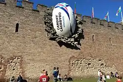 As part of the 2015 Rugby World Cup, Cardiff Castle displays a mock giant rugby ball breaking through its walls.