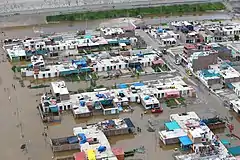 On March 16, a mudflow buried the village of Barbablanca; however, all 160 residents escaped.[21] On March 27, 2017, the Piura River broke its banks and flooded the city of Piura and the towns of Catacaos and Pedregal Chico.[22] In Piura, 300 mm (12 in) of rain fell in one day, three times the city's annual average and Catacaos had flood waters rise to 1.8 m (5.9 ft) high.[22][23] Further south, La Libertad, Áncash, and Lima were also impacted. Trujillo experienced severe localized flooding in its ravines and Huarmey was badly flooded.