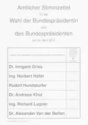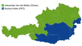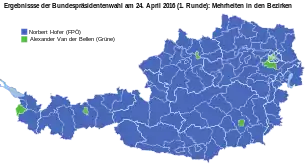 Incumbent President Heinz Fischer had served two terms and was not eligible to be elected for a third successive term. In the first round of the election, Norbert Hofer of the Freedom Party of Austria (FPÖ) historically received the most votes. Alexander Van der Bellen, a member of the Austrian Greens contesting as an independent, placed second, also a historic success for a member of the Greens. The candidates of the two governing parties, the Social Democratic and Austrian People's parties, placed fourth and fifth respectively, behind independent Irmgard Griss in third place, which led to a government crisis and the resignation of Chancellor Werner Faymann. Since no candidate received a majority of the vote, Hofer and Van der Bellen went head-to-head in the second round in May. This was the first time since the Second World War that an Austrian president had not been backed by either the People's or the Social Democratic party.[4] During the run-off, Van der Bellen defeated Hofer on 23 May 2016 after the postal ballots had been counted.[5]