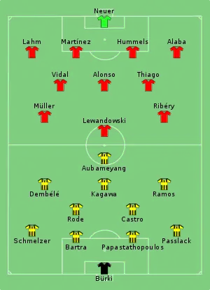 Arturo Vidal scored the opening goal for Bayern Munich in the 58th minute with a low right foot finish from six yards out after his initial shot from just outside the penalty box was parried by goalkeeper Roman Bürki back into his path.[9] Thomas Müller got the second in the 79th minute with a close range finish from inside the six yard box after a knock down header from Mats Hummels following a corner.[10]