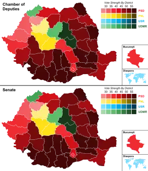 Parliamentary elections were held in Romania on 11 December 2016.[1] They were the first held under a new electoral system adopted in 2015, which saw a return to the proportional electoral system last used in the 2004 elections. The new electoral legislation provides a norm of representation for deputies of 73,000 inhabitants and 168,000 inhabitants for senators, which decreased the number of MPs.[2]