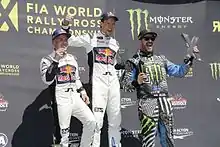 Event podium - (L-R) Toomas Heikkinen, Mattias Ekström and Ken Block
