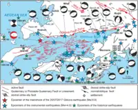 In historical times, many large earthquakes have struck the Gökova associated with the fault zone. Historical earthquakes with a record of damage include 412 BC, 227 BC, 199–198 BC, 24 BC, 141 AD, 174 AD, 344 AD, 474 AD, 554 AD, 1493 AD, 1851 AD, 1863 AD and 1869 AD events. In the 1493 event, the city of Bodrum was totally destroyed.[5] In the 20th century, large instrumentally recorded events (events recorded by seismometers or other instruments) include those of 1933 and 1941 with magnitudes of 6.4 and 6.0 respectively.[6]