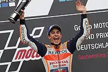 Marc Márquez, celebrating on the podium after winning the MotoGP race.