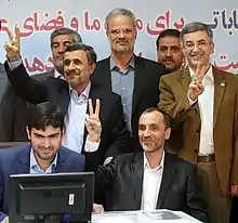 Former president Mahmoud Ahmadinejad and his vice president Hamid Baghaei were disqualified.[10] Ahmadinejad, who was advised by the Supreme Leader Ali Khamenei not to run for the election,[11] wrote a letter in September 2016 to him, pledging that he would not run.[12] On 11 February 2017, he officially declared that he would not back any candidate, however, in a video released on 19 March 2017 he announced his support for Hamid Baghaei[13] and surprised observers by himself registering to run.[14]