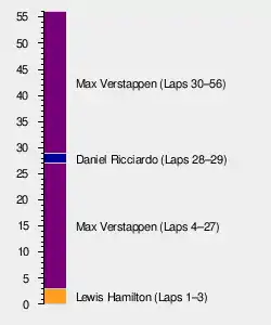 Kimi Räikkönen pulled off the grid due to a power unit issue. Hamilton got off well with Ricciardo, Bottas and Verstappen behind. Verstappen overtook Hamilton for the lead on lap 4, and led until lap 28 when he pitted, leaving Ricciardo in the lead. Ricciardo then also pitted and Verstappen retook the lead. Coming into the last laps, Hamilton tried fighting back but Verstappen won comfortably to take his second win in his career, a year after his previous at the 2016 Spanish Grand Prix.