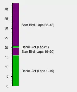 Heidfeld placed pressure onto Abt but Vergne was drawing closer to him, allowing Abt to pull out a small gap over the pair.[48] Vergne began his attack before the opening of the pit stop window and moved past Heidfeld at the turn two chicane for third on lap 18.[51][52] Further down the field, Carroll and Félix da Costa battled each other and both cars made contact, littering the track with debris.[48] On the 21st lap, Abt fell to third when he was passed by Vergne. The mandatory pit stops, during which all drivers need to change into a second car, began on the same lap when Lynn entered the pit lane after Vergne overtook him for sixth position. Bird and Vergne made their pit stops on the same lap, handing the lead back to Abt.[51] Engel set the race's fastest lap on the same lap. His lap of 1 minute, 3.883 seconds earned him one point.[30] Abt was on an alternative strategy, and led for one lap before relinquishing it to Bird.[53] After the pit stops, Bird led Vergne by 2.2 seconds, with Abt five seconds behind Bird.[51] Swift work from Sarrazin's pit crew promoted him to fourth, while Rosenqvist moved to sixth after starting from 17th position, though his teammate Heidfeld fell to eighth.[53]