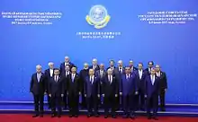 The 2017 SCO summit was the 17th annual summit of heads of state of the Shanghai Cooperation Organisation held between 7 - 10 June in Astana, Kazakhstan.[1] The upgrading of the membership of India and Pakistan to full members was one of the major topics, beside from security related topics, the Belt and Road Initiative and economic cooperation.[2]