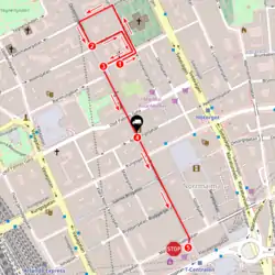 The hijacker then drove the truck at high speed into a pedestrian street, going about 500 metres (1,600 ft) down Drottninggatan, one of Stockholm's main shopping streets, hitting pedestrians along the way. Witnesses said the hijacker attempted to target children as he zigzagged on the street.[13] The attack ended when the truck slammed into the Åhléns City department store on the corner of Drottninggatan and Mäster Samuelsgatan. The truck caught fire, but the flames were quickly doused by firefighters. The hijacker jumped out and fled the scene.[14]