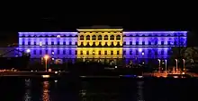 Finland's Ministry for Foreign Affairs, lit up in the colours of the Swedish flag, in order to commemorate the victims