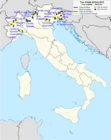 The race consisted of 10 stages totalling 905.8 km (562.8 mi), beginning in Cassano Spinola on 5 July with a team time trial and finishing in Udine on 14 July. Though originally 918.3 km (570.6 mi) in length, landslides forced the route of stage 5 to be rerouted.[2]