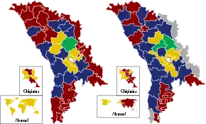 Parliamentary elections were held in Moldova on 24 February 2019[1] in order to elect the 101 members of the Parliament of Moldova. The Constitution holds that elections are to be held no later than four years and three months from the date of inauguration of the previous legislature.[2] The elections were held under a parallel voting system, replacing the closed-list proportional system used in Moldova at all previous parliamentary elections since the independence. The electoral campaign period began in November 2018 and continued up until the election day.[3] Candidates from four parties were elected to the Parliament, more specifically the Party of Socialists of the Republic of Moldova (PSRM), the Democratic Party of Moldova (PDM), the ACUM electoral alliance composed of the DA and the PAS, and the Șor Party. The Party of Communists (PCRM) failed to obtain any seats for the first time since the independence of the Republic of Moldova. The results were subsequently confirmed and validated by Moldova's Constitutional Court on 9 March 2019.[4] Furthermore, the results triggered a constitutional crisis in June.