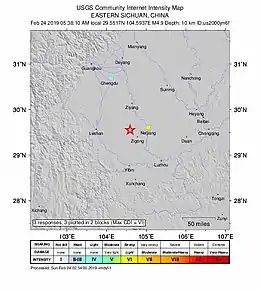 According to the China Seismological Network, the epicentre of the earthquake was located in Rong County, Zigong City, Sichuan Province, China (29.48°N, 104.49°E), with a magnitude of Ms 4.9, a depth of about 5 km, and a maximum intensity of VI degrees.[2][3] The U.S. Geological Survey and the European Mediterranean Seismological Center (EMEC) determined the same numerical magnitude as that of China, both at mb 4.9, while both measured a source depth of about 10 km.[10][11] The lower magnitudes measured by the GEOFON standard station network of the German Research Centre for Geosciences, for MB 4.8 level.[12] In addition, based on seismic reports collected by the online Internet seismic survey, the USGS, the maximum intensity of this earthquake was presumed to be VI on February 24, 2019. And after 2 days, the agency revised the intensity presumed by this method to IV.[13]