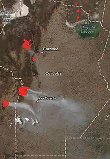 - ↑ Garrison, Cassandra; Heath, Maximilian (2020-08-24). "Raging fires in Argentina's Cordoba province prompt evacuations, threaten homes". Reuters. Retrieved 2020-10-01.