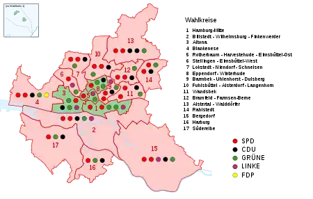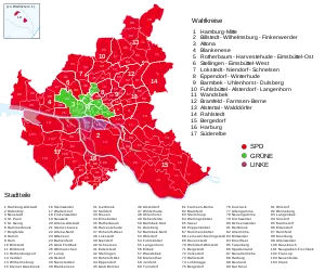 Despite losses, the SPD remained comfortably in first place with 39% of votes. The Greens doubled their vote share to 24%, becoming the second largest party in the state Parliament for the first time.[2] The opposition Christian Democratic Union (CDU) suffered their worst ever result in Hamburg, and their worst result in any state election since 1952, falling to third place with 11% of votes.[3] The Left achieved a small upswing and remained in fourth place. The Alternative for Germany (AfD) narrowly cleared the 5% electoral threshold, recording a decline compared to its previous result for the first time in any state or national-level election. The Free Democratic Party lost a third of its vote share and fell narrowly short of the 5% electoral threshold, in total winning only one seat from a direct constituency.
