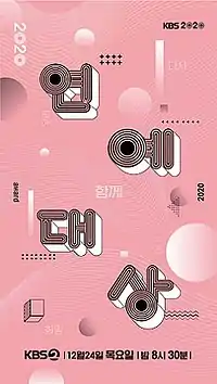 The 2020 KBS Entertainment Awards presented by Korean Broadcasting System (KBS), took place on December 24, 2020 at KBS New Wing Open Hall in Yeouido-dong, Yeongdeungpo-gu, Seoul. It was hosted by Jun Hyun-moo, Jin Se-yeon and Kim Jun-hyun.[1][2]