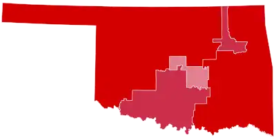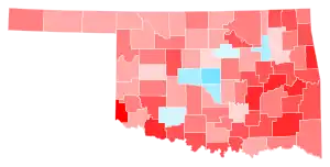 Trump easily carried Oklahoma on Election Day by a margin of 33.08%, down from 36.39 points in 2016. Oklahoma was one of two states where Trump won every county, the other being West Virginia. This also signaled the fifth consecutive election in which the Republican candidate carried every county in the state, including those counties encompassed by Native American reservations. In this election, Trump also became the first presidential candidate ever to win more than a million votes in Oklahoma.[4] Biden, however, came within 3,326 votes of winning Oklahoma's most populous county Oklahoma County, and won more than 40% of the vote in Oklahoma's second-most populous county Tulsa. No Democratic presidential candidate has won Oklahoma County since Lyndon B. Johnson in his 1964 landslide, or Tulsa County since Franklin D. Roosevelt in his 1936 landslide. This is the first election since 2000 in which not every county voted in the majority for the Republican. However, these gains in urban Oklahoma were offset by continued falloff in southeast Oklahoma, where Biden even underperformed Hillary Clinton's performance four years earlier in most counties.