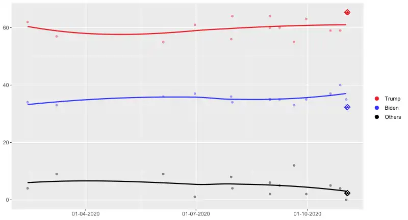 | FiveThirtyEight | until November 2, 2020 | November 3, 2020 | 36.2% | 59.2% | 4.6% | Trump +23.0 |