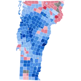 This is the first time Vermont was the strongest state for either party since 1956, when it was Republican Dwight D. Eisenhower's best state. Vermont also saw the largest increase in turnout from 2016, increasing 14.3%.[4] Biden greatly improved on Hillary Clinton's 55.7% vote share and 25.9% margin from 2016, when third-party candidates received over 14% of the vote.[5] Biden's performance was also the fourth-strongest Democratic performance in state history. Trump carried only one county, sparsely-populated Essex bordering New Hampshire, which had voted for the winner from 1980 to 2016. Consequently, Biden became the first president to win without the county since Jimmy Carter in 1976.