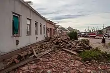 The tornado caused widespread power outages, with approximately 121,000 households left without electricity in the region.[7] 1202 buildings were damaged or destroyed. 180 buildings that did not completely collapse were scheduled for demolition.[19] The D2 motorway linking Brno with Bratislava in Slovakia was closed.[8][20] Rescue teams from across the country (including Prague) and also from neighboring Austria and Slovakia were deployed,[17] as was the Czech Army.[21] The total damage to public property has been so far estimated at 15+ billion CZK. Damages to privately owned properties are expected to be many times higher, but the exact numbers are still unknown.[22]