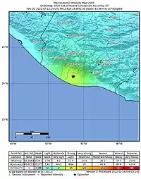 The 2022 Guatemala earthquake occurred on the early morning of February 16, 2022 in the southern regions of Guatemala. The quake measured a moment magnitude of 6.2 and reached a peak intensity of VI (Strong) on the Modified Mercalli Intensity scale.[2] Damage was widespread but light in and around the capital, Guatemala City, resulting mostly in cracked walls and rockslides.[3][4]