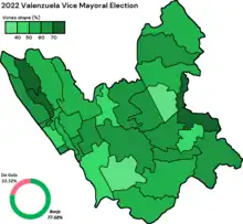 Local elections were held in Valenzuela on May 9, 2022, as part of the Philippine general election. Held concurrently with the national elections, the electorate voted to elect a mayor, a vice mayor, twelve city council members, and two district representatives to congress. Those elected took their respective offices on June 30, 2022, for a three-year-long term. 350,676 out of 443,611 registered voters voted in this election.[1]