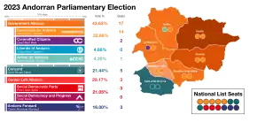 In the parliamentary elections in Andorra on 2 April 2023,[1] the incumbent liberal-conservative coalition between Democrats for Andorra (DA) and Committed Citizens (CC) won an absolute majority led by Prime Minister Xavier Espot. This is the fourth legislature in a row in which DA governs the country. A new party, Concord, emerged in second place, taking the opposition leadership held by the Social Democratic Party since 2019, which fell to third place by losing four seats.