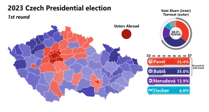 The first round took place on 13 and 14 January. Petr Pavel, former chair of the NATO Military Committee, ran as an independent on a pro-Western, pro-European platform,[1] and was one of three candidates backed by the centre-right governing alliance Spolu.[2] He won the first round of the election with 35.40% of the popular vote, ahead of Andrej Babiš, the former Czech prime minister running as the candidate of ANO 2011, who finished second with 34.99%.[3] Babiš had expressed opposition to Czech support for Ukraine after the Russian invasion and was characterised in the media as using populist rhetoric.[4][5] For the runoff, Pavel was backed by most eliminated candidates and by the incumbent prime minister Petr Fiala, while Babiš received an endorsement from the Communist Party of Bohemia and Moravia[6] and the outgoing president Zeman.[7]