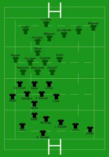 | Try: Smith 4' c Frizell 14' c Jordan 68' c Mo'unga 76' m Con: Mo'unga (3/4) 5', 16', 69' Pen: Mo'unga (3/3) 9', 37', 59' | Report | Try: Marx 52' c Kolbe 61' m Smith 79' m Con: Kolbe (1/2) 54' Pen: De Klerk (1/1) 35' |