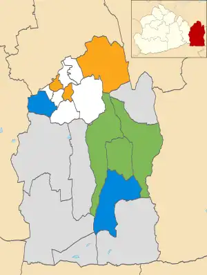 ![]() Independents in grey, Liberal Democrats in yellow, Oxted & Limpsfield Residents in green and Conservatives in blue. Wards in white were not contested in 2023. | |||||||||||||||||||||||||||||||||||||||||||||||