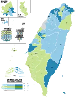 The results saw the ruling Democratic Progressive Party (DPP) lose its majority in the Legislative Yuan that it had held since 2016, losing 10 seats and retaining 51, while the Kuomintang (KMT) became the largest single party with 52 seats, and the Taiwan People's Party (TPP) won eight seats. The New Power Party lost all its three seats after failing to win a constituency seat or meet the 5% threshold for at-large representation. The election marked the first time under the current electoral system that no party held an absolute majority in the Legislative Yuan.[3] The term of the Legislative Yuan is scheduled to begin on 1 February 2024.