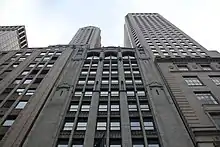 Looking up at the building's 50th Street facade, with the Swiss Bank Tower at right
