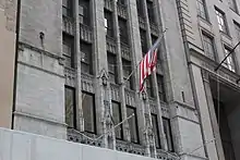 A flagpole hangs from the top of the arcade and two more from the top of the second story (the floor directly above the arcade). The intermediate stories on 50th Street are treated as subdivided vertically into three bays, each with a pair of windows. The windows on each different story are separated by spandrels with Gothic tracery. The top story has round pointed arches as well as finials.[11]