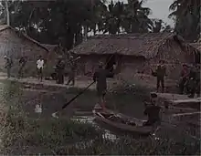 A dead lieutenant from the 1st Battalion, 31st Infantry is transported by sampan following an ambush near Vi Thanh, Chương Thiện Province, 22 July 1964