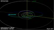 225 Henrietta is a very large outer main-belt asteroid. It was discovered by Austrian astronomer Johann Palisa on April 19, 1882, in Vienna and named after Henrietta, wife of astronomer Pierre J. C. Janssen.[2] The asteroid is orbiting at a distance of 3.39 AU from the Sun with a period of 6.24 years and an eccentricity (ovalness) of 0.26. The orbital plane is inclined at an angle of 20.9° to the plane of the ecliptic.[1] 225 Henrietta belongs to Cybele group of asteroids and is probably in a 4:7 orbital resonance with the planet Jupiter.[3]