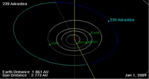 Adrastea (minor planet designation: 239 Adrastea) is a main belt asteroid. It was discovered by Johann Palisa on 18 August 1884 in Vienna, and was named after the Greek nymph Adrasteia. This asteroid is orbiting the Sun at a distance of 2.97 AU with a period of 5.11 years and an eccentricity (ovalness) of 0.23. The orbital plane is tilted at an angle of 6.17° to the plane of the ecliptic.[1]