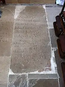 In 1783 number 26 was occupied by Francis Gawthern's great-nephew, also called Francis, who married Abigail Frost in 1783. Abigail Gawthern lived until 1822 and her diary survived; it is a remarkable record of the history of Nottingham from 1751 until 1810.[5] Number 26 became known as Gawthern House. In her diary for 21 August 1798 she records that her visitors were Lord Byron, the two Miss Parkyns (of Bunny Hall), and the two Master Smiths from Wilford Hall. Abigail Gawthern was buried in St Mary's Church, Nottingham, where her memorial slab was discovered in 2012 during the restoration of the church floor.