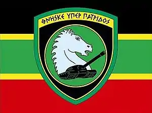 The unit emblem was adopted in 1979, and features the head of a horse and a tank within a green circle—the traditional colour of the Hellenic Army's Cavalry–Armour arm—on a black background.[1] It also includes the unit motto, «ΘΝΗΣΚΕ ΥΠΕΡ ΠΑΤΡΙΔΟΣ» ("Die for the fatherland"), attributed to the Ancient Corinthian statesman Periander.[1]