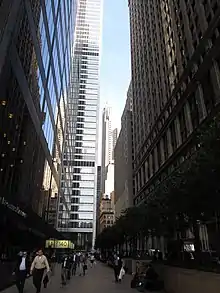 Cedar Street was closed in the late 1950s to make way for 28 Liberty Street's construction.[7][8] In exchange for acquiring the block of Cedar Street, Chase agreed to cede 8 to 15 feet (2.4 to 4.6 m) on each side of the lot for street-widening, paid the city $100,000, and took responsibility for utilities under the newly closed portion of Cedar Street.[13][12] The city had rarely closed streets for private commercial development, except when there was "substantial" benefit to the public, such as with Grand Central Depot (later Grand Central Terminal) and the original Pennsylvania Station.[7] Chemical Bank, which purchased the adjacent 20 Pine Street, agreed to carve out an arcade on that building along the southern facade of the ground level in order to allow the widening of the Pine Street sidewalk.[13]